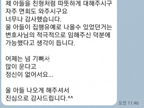 형사사건은 당사자뿐만 아니라 가족 모두에게 큰 고통과 불안을 안겨줍니다. 특히 처음 겪는 사건이라면 두려움과 막막함은 더욱 클 수밖에 없습니다. 이번 사건에서 의뢰인의 가족은 처음엔 부끄럽고 힘든 마음 때문에 상담조차 망설였다고 합니다. 그러나 사건을 맡아 진행하면서, 저희 법무법인 한경은 피고인을 단순한 사건 당사자가 아닌 가족처럼 따뜻하게 대하며, 자주 면회를 통해 상황을 점검하고 정서적인 안정까지 도울 수 있도록 최선을 다했습니다. 그 결과, 피고인은 집행유예 판결을 받을 수 있었고 곧바로 가족의 품으로 돌아올 수 있었습니다. 의뢰인 가족분께서는 다음과 같은 진심 어린 말씀을 전해주셨습니다. “제 아들을 친형처럼 따뜻하게 대해주시고 자주 면회도 와주시고… 너무나 감사했습니다. 아들이 집행유예로 나올 수 있었던 것은 변호사님의 적극적인 변론 덕분이라 생각합니다. 어제는 기뻐서 많이 울 정도였어요. 진심으로 감사드립니다.” 이러한 따뜻한 인사를 받을 때마다, 저희는 단순히 사건을 해결하는 것을 넘어 한 사람의 인생과 가족의 행복을 지켜내는 변호사의 책임과 사명을 다시금 느낍니다. 앞으로도 법무법인 한경은 서울, 대구, 부산에서 의뢰인들의 곁에서 끝까지 함께하며, 최선의 결과를 만들어 내겠습니다!