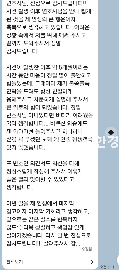의뢰인은 사건이 마무리된 이후 “힘든 시간을 버틸 수 있었던 것은 변호사님의 도움 덕분이었다”며 깊은 감사의 뜻을 전했습니다.