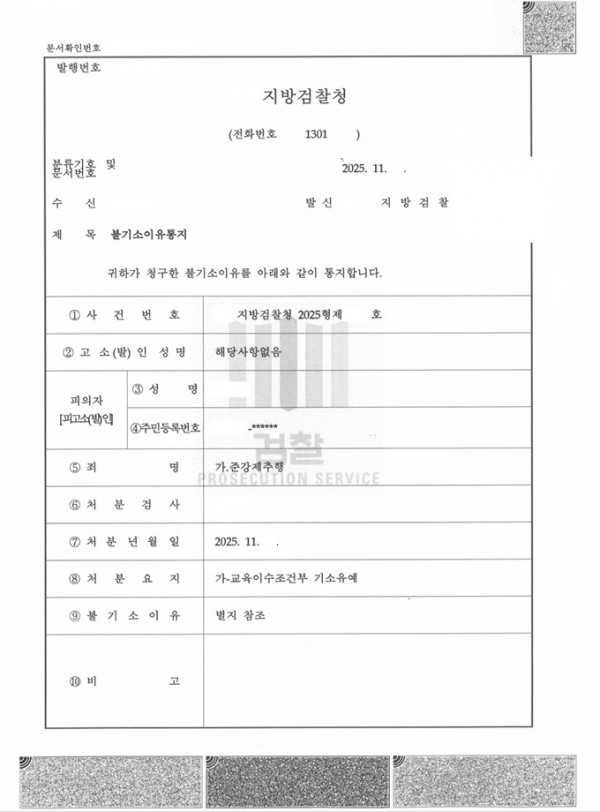 본 건에 대해 “가. 교육이수조건부 기소유예” 처분을 내렸습니다.