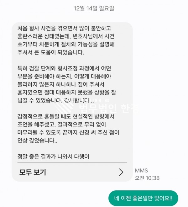 저희 법무법인한경과 빠른 선임으로 사건 초기부터 개입하여 형사 절차 및 전반적인(수사·검찰 단계·형사조정 가능성)내용들을 차분하게 설명해 드렸고,